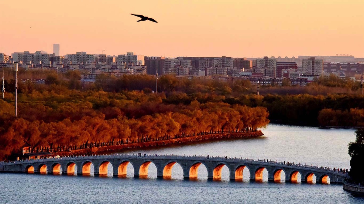The setting sun shines through the Seventeen-Arch Bridge over Kunming Lake in the Summer Palace in Beijing. [Photo/IC]