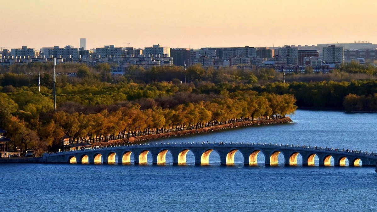 The setting sun shines through the Seventeen-Arch Bridge over Kunming Lake in the Summer Palace in Beijing. [Photo/IC]