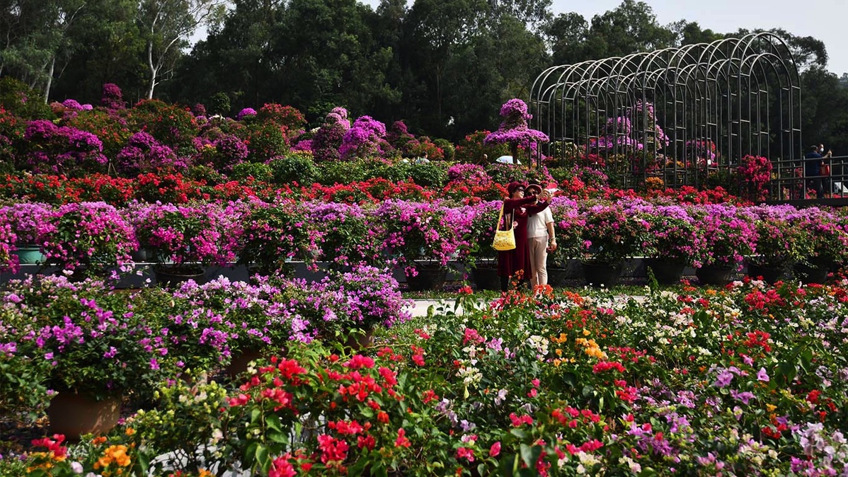 Visitors take a selfie at the 2022 Shenzhen Bougainvillea Show. [Photo/IC]
