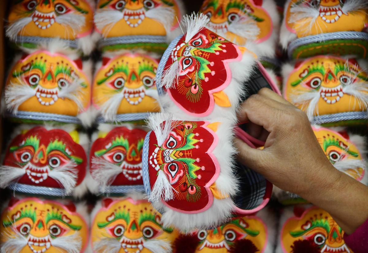 Tiger-head shoes are shown in Zhangxibu township in the Yongnian district of Handan, Hebei province. [Photo by Hu Gaolei/ For chinadaily.com.cn]