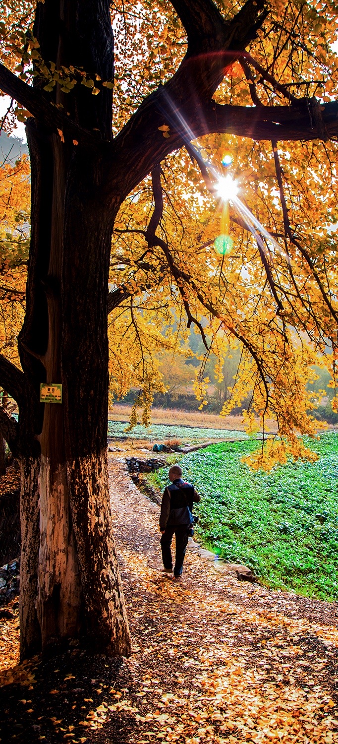 A man walks past a large ginkgo tree in Anlu, Hubei province. [Photo provided to chinadaily.com.cn]