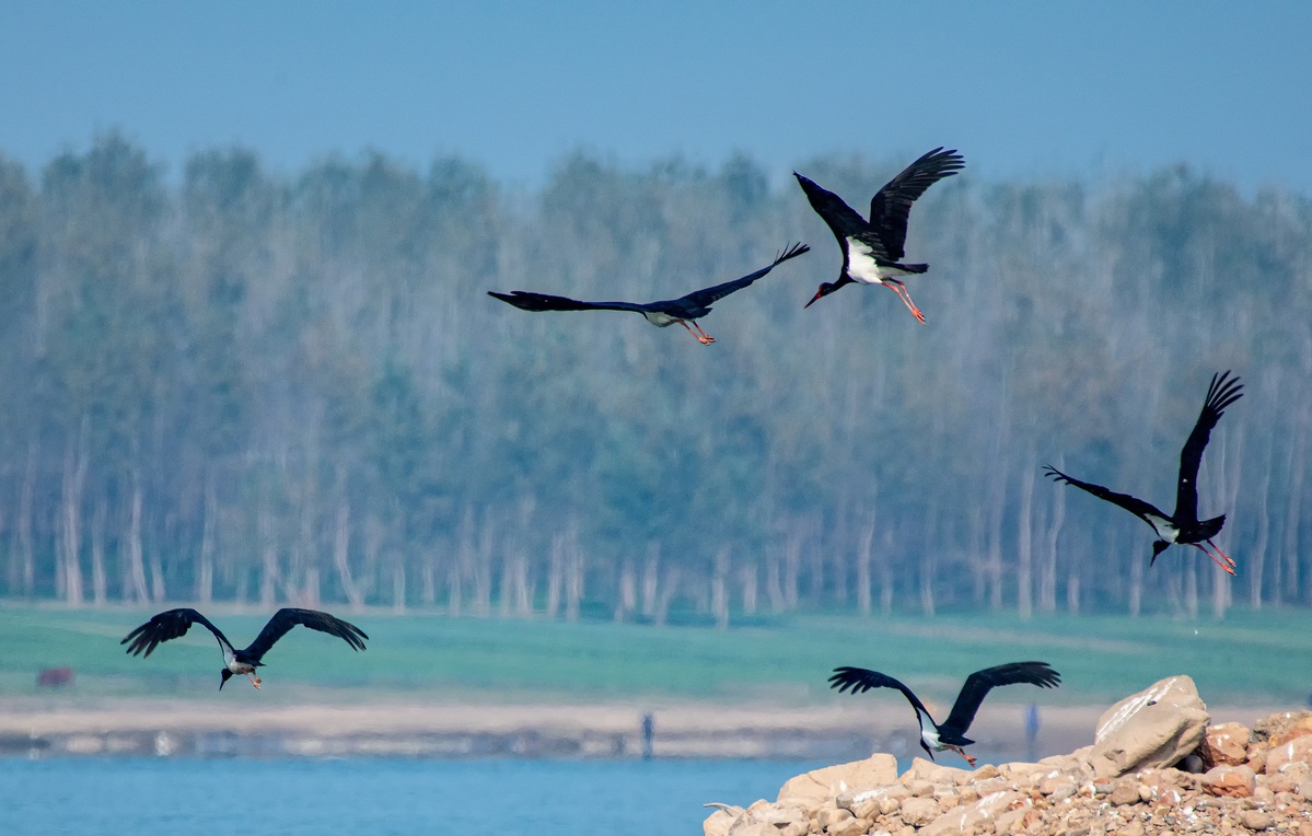 A photo shows black storks flying along the banks of the Yangtze River in Yidu, Hubei province. [Photo by Feng Jian/For chinadaily.com.cn]
