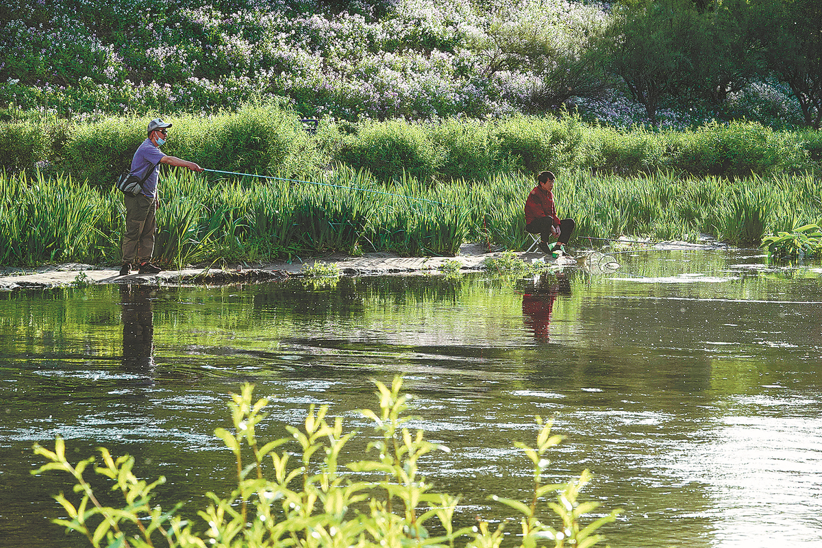 Residents fish along the Yangqiao section of the Liangshui River in Beijing on April 22. WANG XIBAO/FOR CHINA DAILY