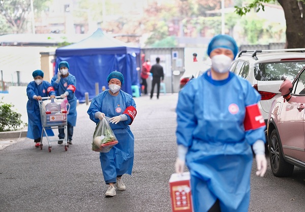 Residents, taxi drivers, deliverymen and others volunteer to help distribute daily necessities to people in Chongqing. [By Guo Xu/For chinadaily.com.cn]