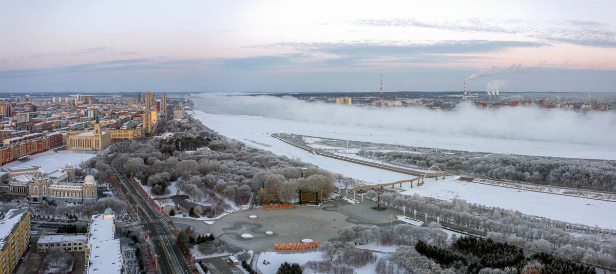An aerial photo shows the natural beauty of soft rime along the Heilong River in Heihe, Heilongjiang province. [Photo by Wang Dianjie/For chinadaily.com.cn]