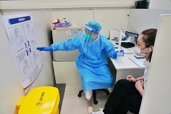 A resident prepares to take an inhaled COVID-19 booster vaccination at Shanghai Changning Tianshan Traditional Medicine Hospital. [Photo by Gao Erqiang/chinadaily.com.cn]