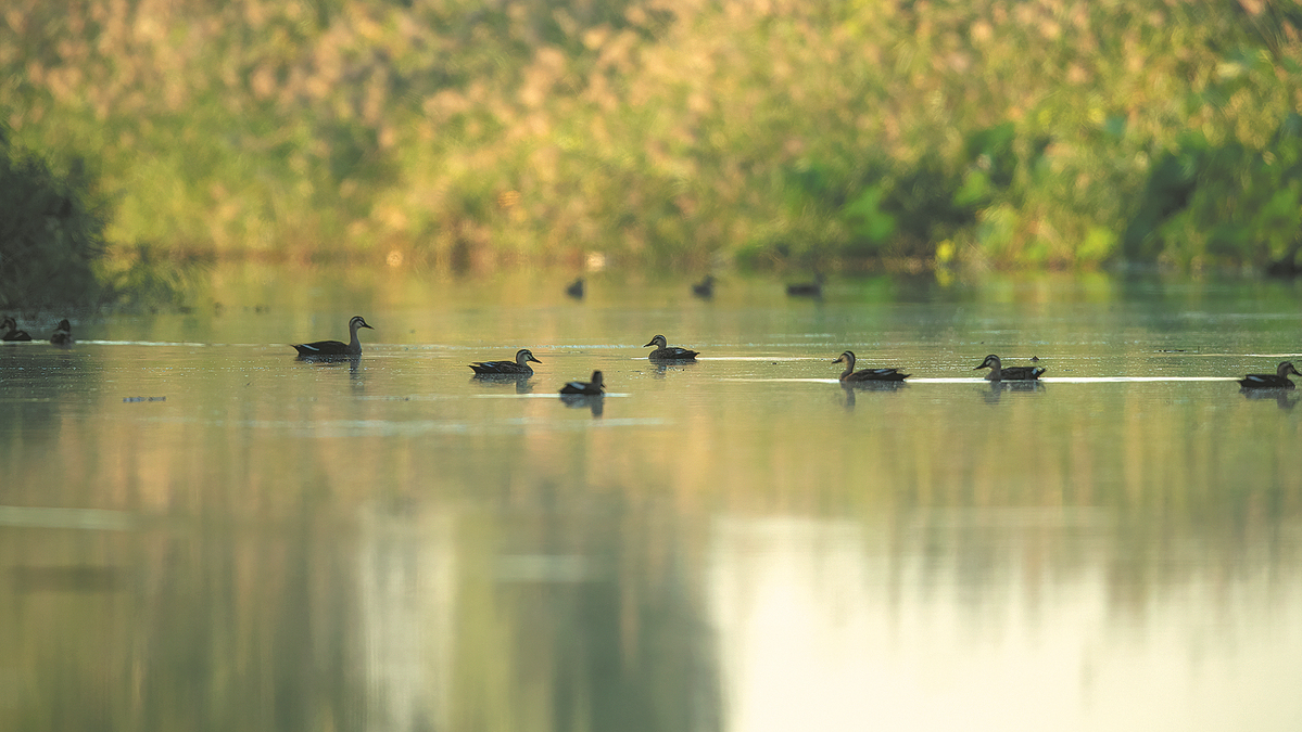 A flock of Chinese spot-billed ducks roosts on Baiyangdian Lake in Xiong'an New Area, Hebei province. [Photo by LIU XUN/FOR CHINA DAILY]