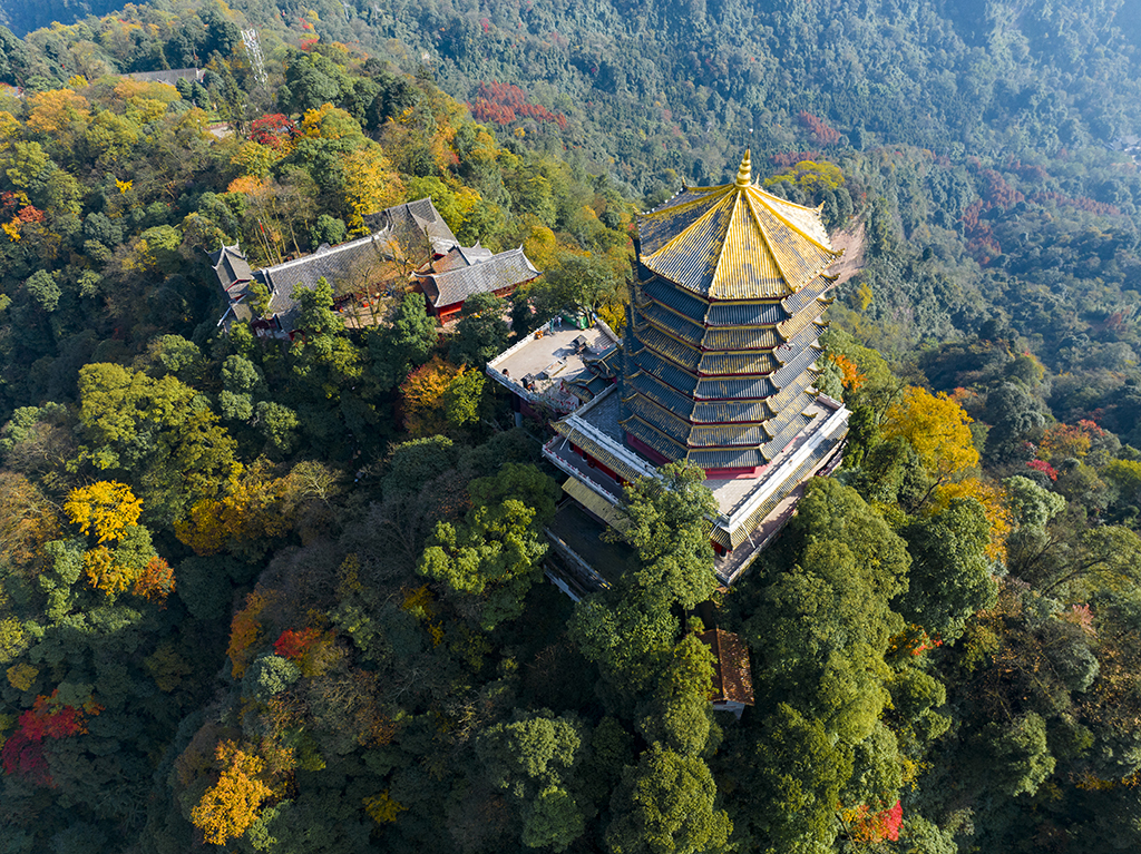 Aerial view of the majestic Laojun Pavilion at the top of Mount Qingcheng in Dujiangyan, Chengdu, Sichuan province [Photo/IC]