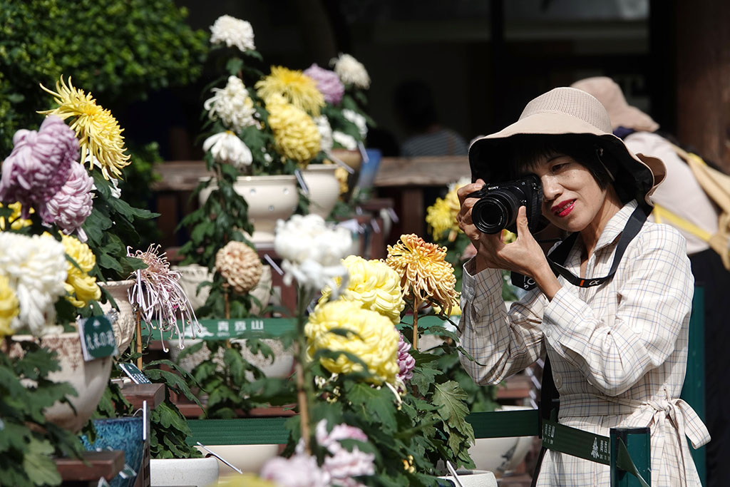 A woman takes photos of blooming chrysanthemums at the seventh Qingxiu Mountain Chrysanthemum Exhibition. [Photo/IC]