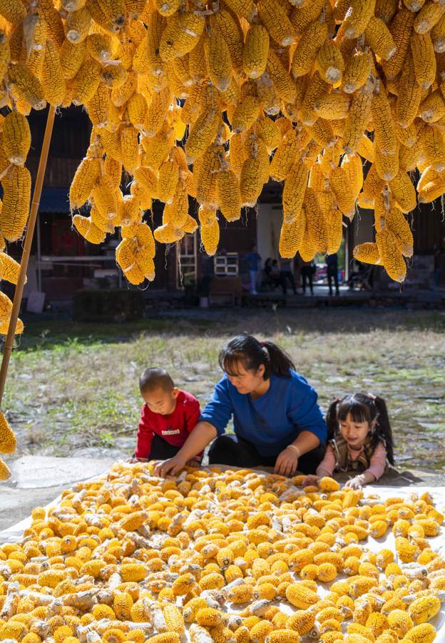 Residents of Meilin village in Zhangzhou, Fujian province, dry newly harvested corn in earthen buildings. [Photo by Zhang Xu/Provided to chinadaily.com.cn]