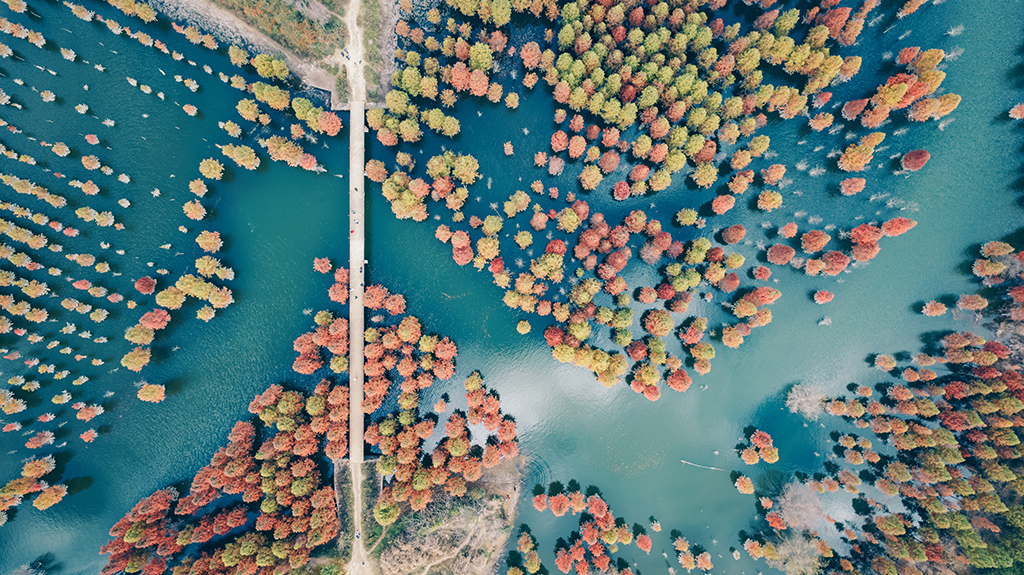 Aerial view of colorful dawn redwood forests in Dianwei village, Kunming, Yunnan province [Photo/IC]