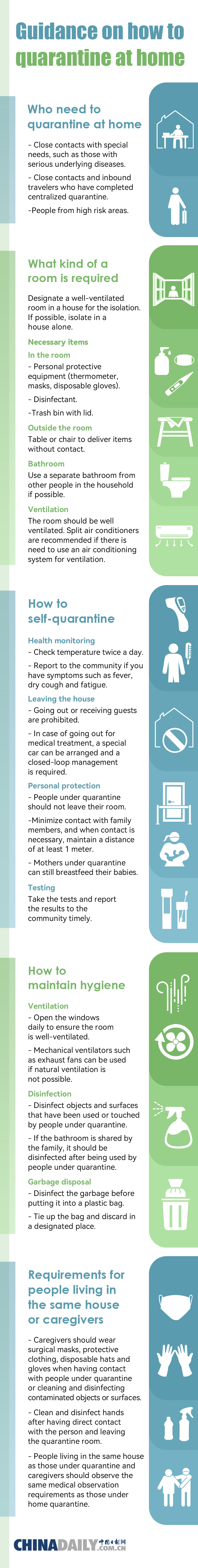 Some cities in China have optimized their COVID-19 prevention and control measures and allowed certain groups of people to self-isolate at home. The Joint Prevention and Control Mechanism of the State Council has issued a guideline on home quarantine and medical observation. The following are some highlights of the guideline.