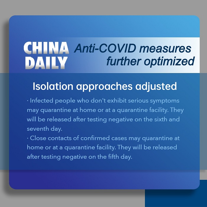 The State Council's Joint Prevention and Control Mechanism on Wednesday released 10 new COVID-19 control measures, which include allowing asymptomatic or mild cases to isolate at home rather than having to report to centralized quarantine facilities. The 10 new measures follow the launch of 20 adjusted measures that were released on Nov 11.