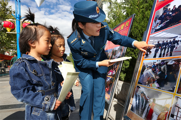Sonam discusses national defense with Tibetan children during an activity to mark Nationwide National Defense Education Day (the third Saturday in September) in Lhasa, Tibet.