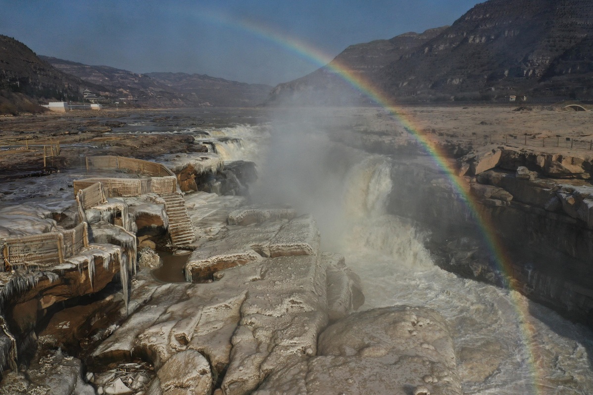 A rainbow arches over Hukou Waterfall on the Yellow River in Jixian county of Shanxi province. [Photo by Lyu Guiming/For chinadaily.com.cn]
