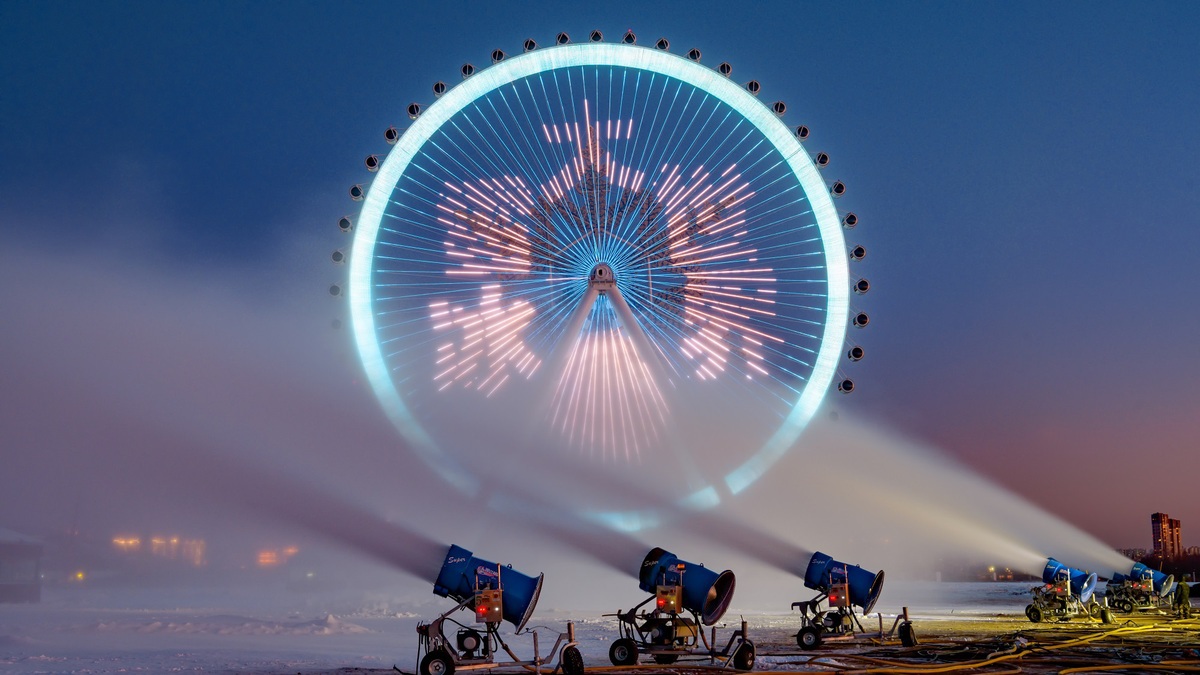 A giant Ferris wheel in the shape of a snowflake has been built for the 24th Harbin Ice and Snow World in Harbin, Heilongjiang province. [Photo provided to chinadaily.com.cn]