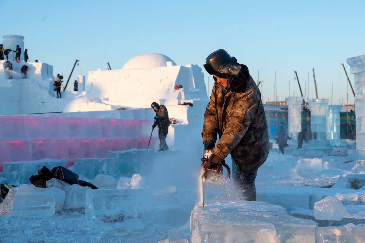A photo shows workers processing ice blocks for the 24th Harbin Ice and Snow World in Harbin, Heilongjiang province. [Photo provided to chinadaily.com.cn]