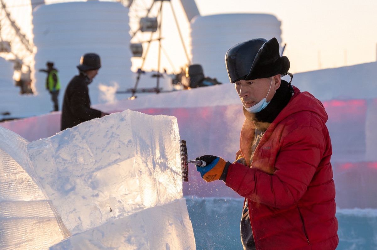 A photo shows workers processing ice blocks for the 24th Harbin Ice and Snow World in Harbin, Heilongjiang province. [Photo provided to chinadaily.com.cn]