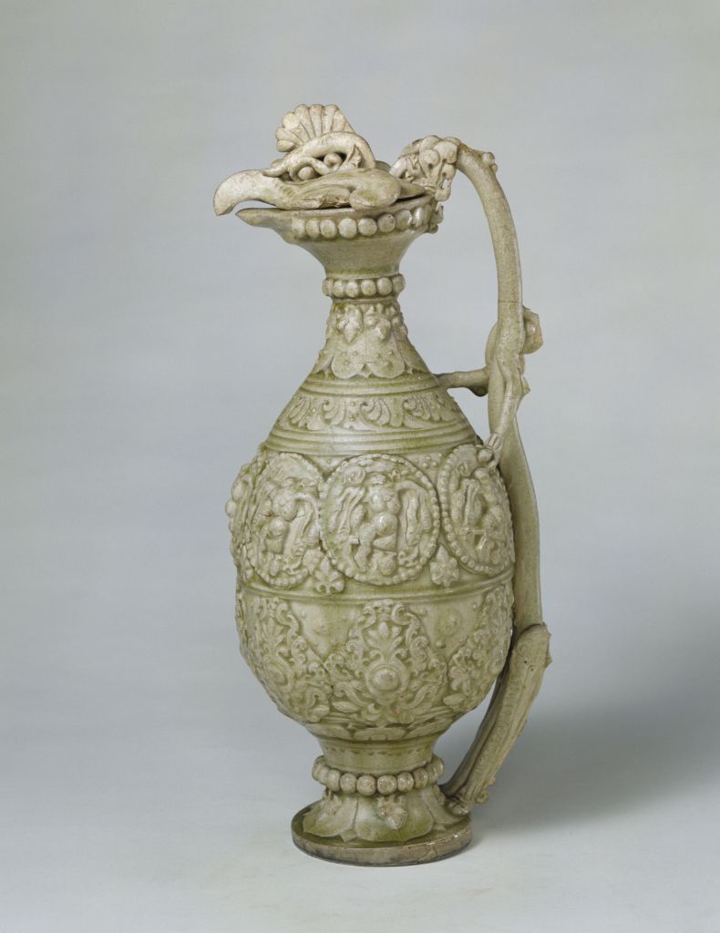Various patterns decorate the ewer, including lotuses, plants and beaded medallions.