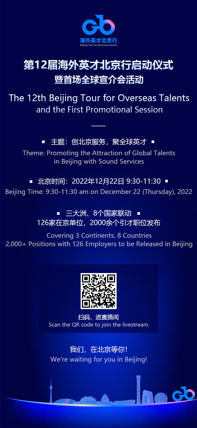 The 12th Beijing Tour for Overseas Talents will be launched on December 22.