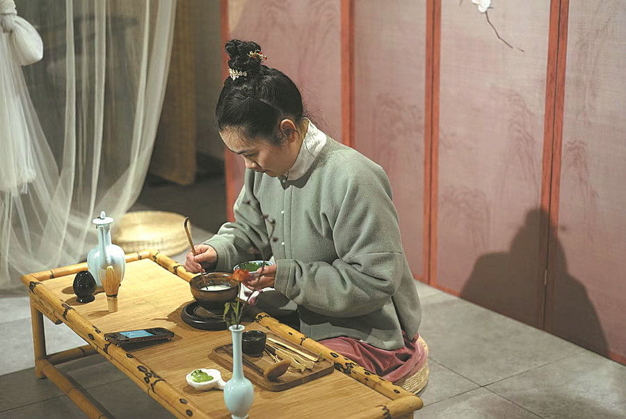 A villager displays the traditional tea-making technique of dian cha at the homestay she runs in Jingshan village in Hangzhou, Zhejiang province. [Photo/China Daily]