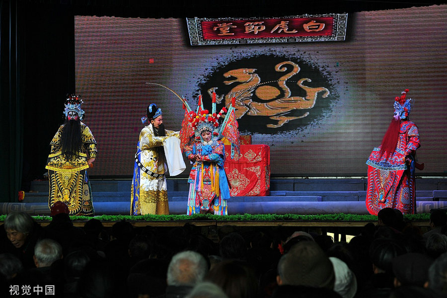 Local people enjoy the opera show to celebrate the tea harvest during the "tea market" temple fair, Nov 30, 2020. [Photo/VCG]