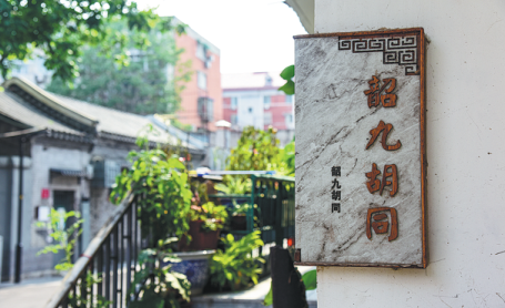 Adjacent to the bustling Wangfujing shopping area, Shaojiu Hutong remains a tranquil place. A speed limit sign for motor vehicles has been erected at the hutong's entrance. The few cars that pass by slow down when the drivers see the reminder "one way only, pedestrians first" painted on the ground.