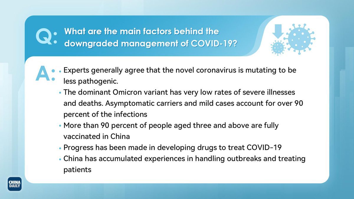 From Jan 8, China will manage COVID-19 with measures against Class B infectious diseases, instead of Class A infectious diseases. Here we answer some questions concerning the latest shift in the country's epidemic response policies.