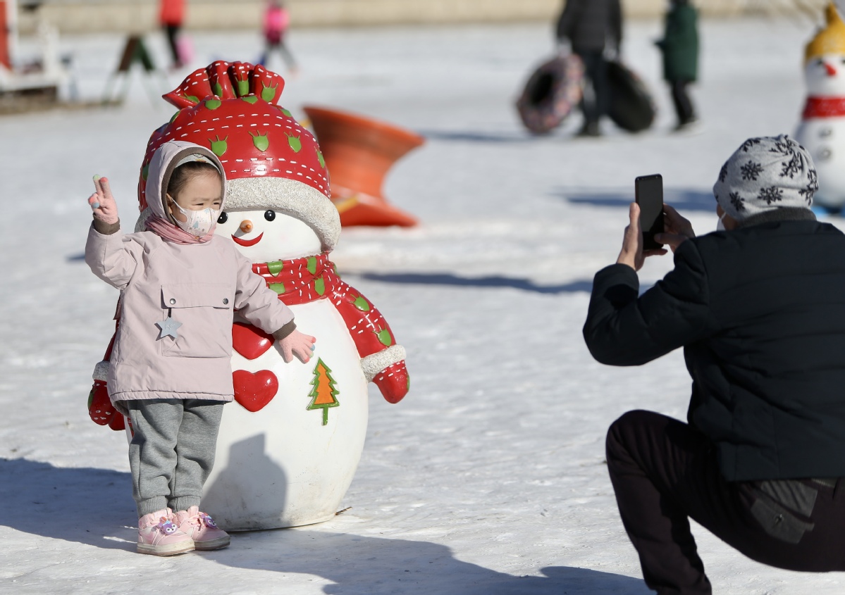 A man takes a photo of his daughter at Beiling Park in Shenyang, Liaoning province, on Jan 2, 2023. People enjoy ice and snow activities despite the extreme cold. [Photo/IC]