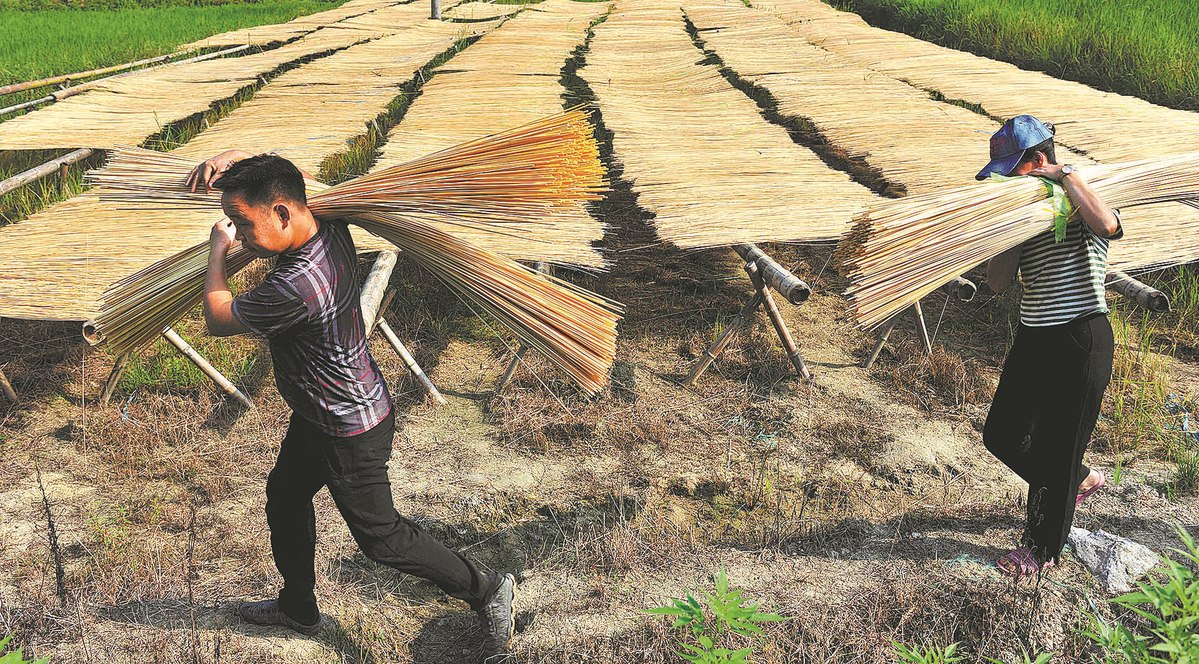A worker prepares materials for making bamboo utensils in Jiaohu village in Yichun city, Jiangxi province, in July 2021. DENG LONGHUA/FOR CHINA DAILY