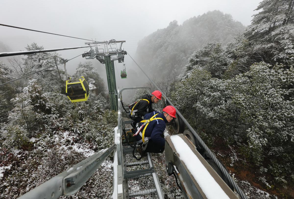 Workers check for potential safety hazards on the high-altitude passenger tram at Wulingyuan scenic spot in Zhangjiajie, Hunan province, on Monday. [Photo by Wu Yongbing/For chinadaily.com.cn]