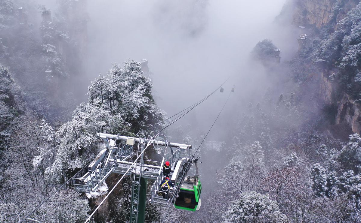 Workers check for potential safety hazards on the high-altitude passenger tram at Wulingyuan scenic spot in Zhangjiajie, Hunan province, on Monday. [Photo by Wu Yongbing/For chinadaily.com.cn]