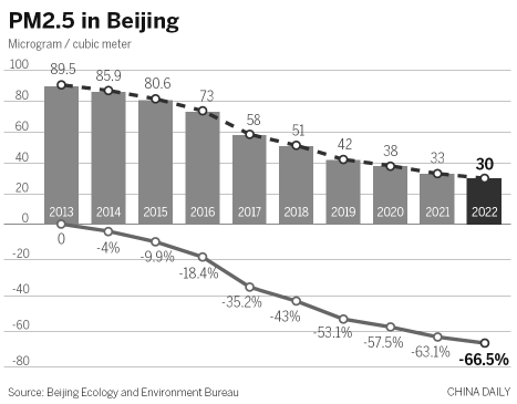 Beijing's annual average concentration of major airborne fine particulate matter, or PM2.5, declined to 30 micrograms per cubic meter in 2022, the best air quality for the city since 2013, the municipal authority announced on Wednesday.
