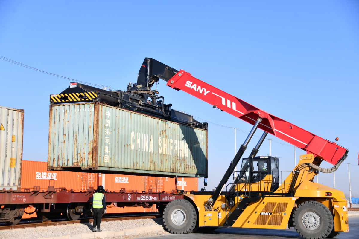 A freight train loaded with Chinese wind power equipment left Lanzhou, Gansu province, for Uzbekistan on Jan 1. [Photo by Bai Yiwei/Provided to chinadaily.com.cn]