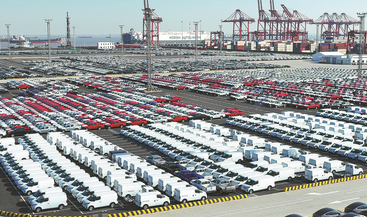 A batch of cars and excavators for export to the European market are seen at the foreign trade car terminal yard of Taicang Port in Jiangsu province in December. [Photo provided by Ji Haixin/for China Daily]