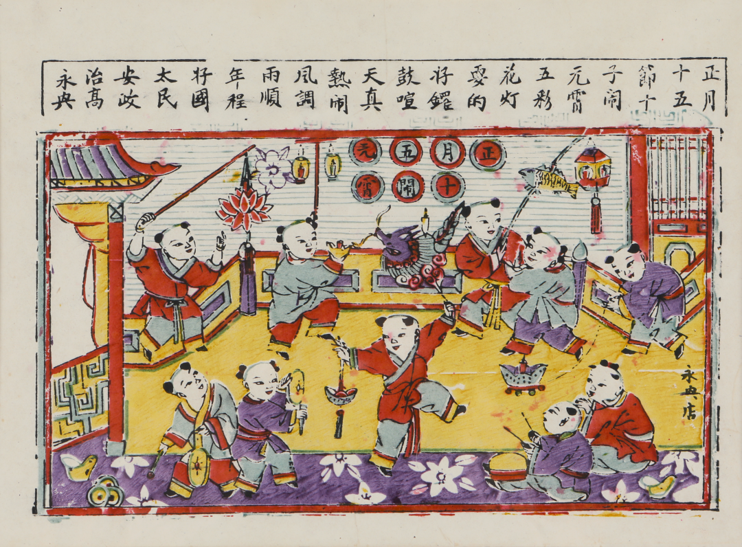 Chinese New Year painting depicting ten children celebrating Lantern Festival, product of Yangjiabu, from the collection of the Shandong Art Museum [Photo/Official WeChat account of the Guangdong Museum]