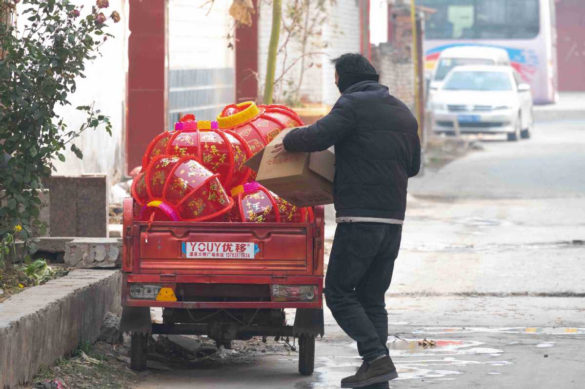 A man loads lanterns into a tricycle in Xubeizhang village of Jiaozuo, Central China's Henan province, on Jan 5, 2023. As Spring Festival is approaching, villagers in Xubeizhang are busy rushing lantern orders to supply the market. [Photo/IC]
