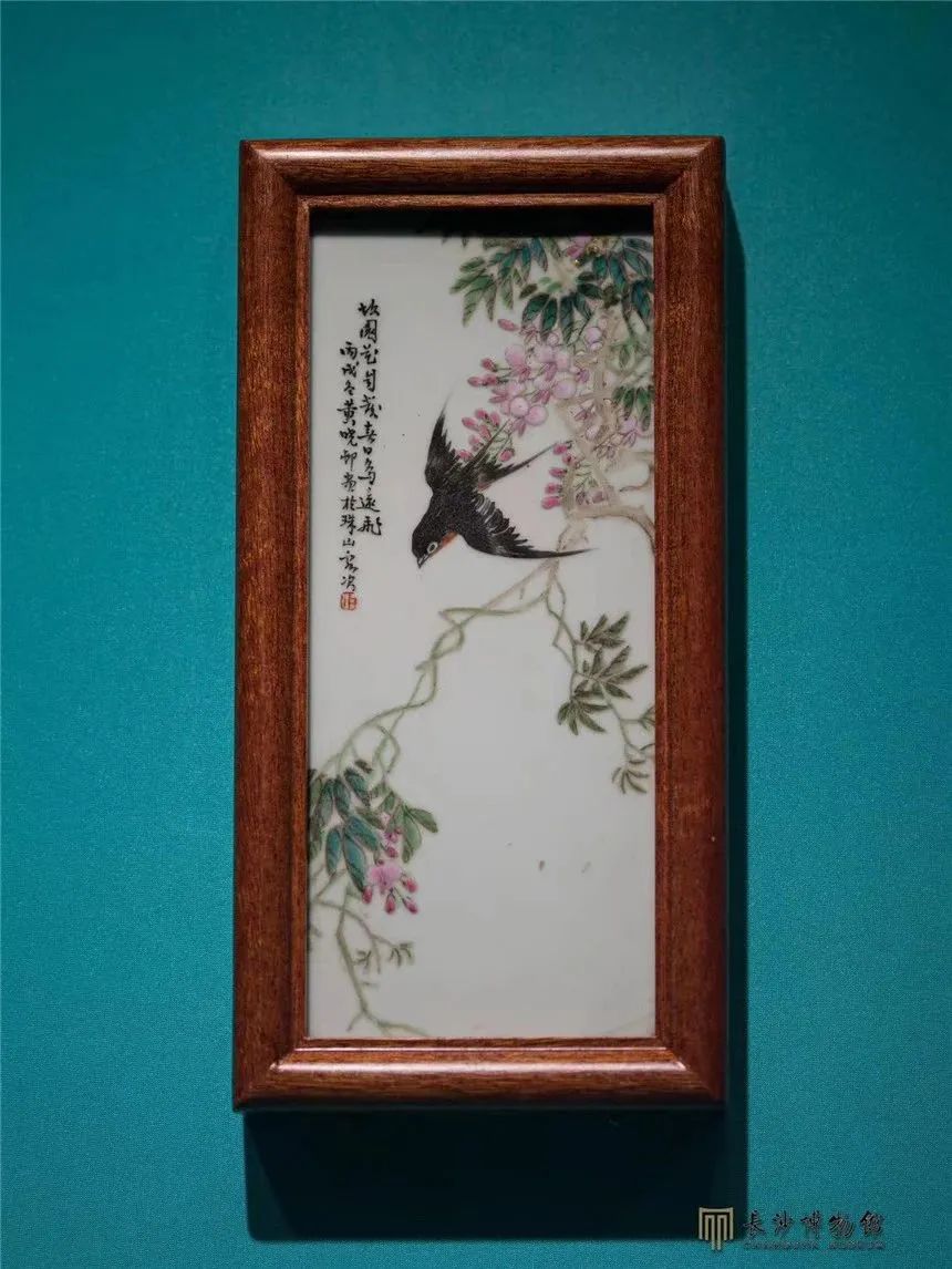 Famille-rose ceramic plaque with depicting a swallow and wisteria, 1946, from the collection of the Changsha Museum [Photo/Official WeChat account of the Changsha Museum]