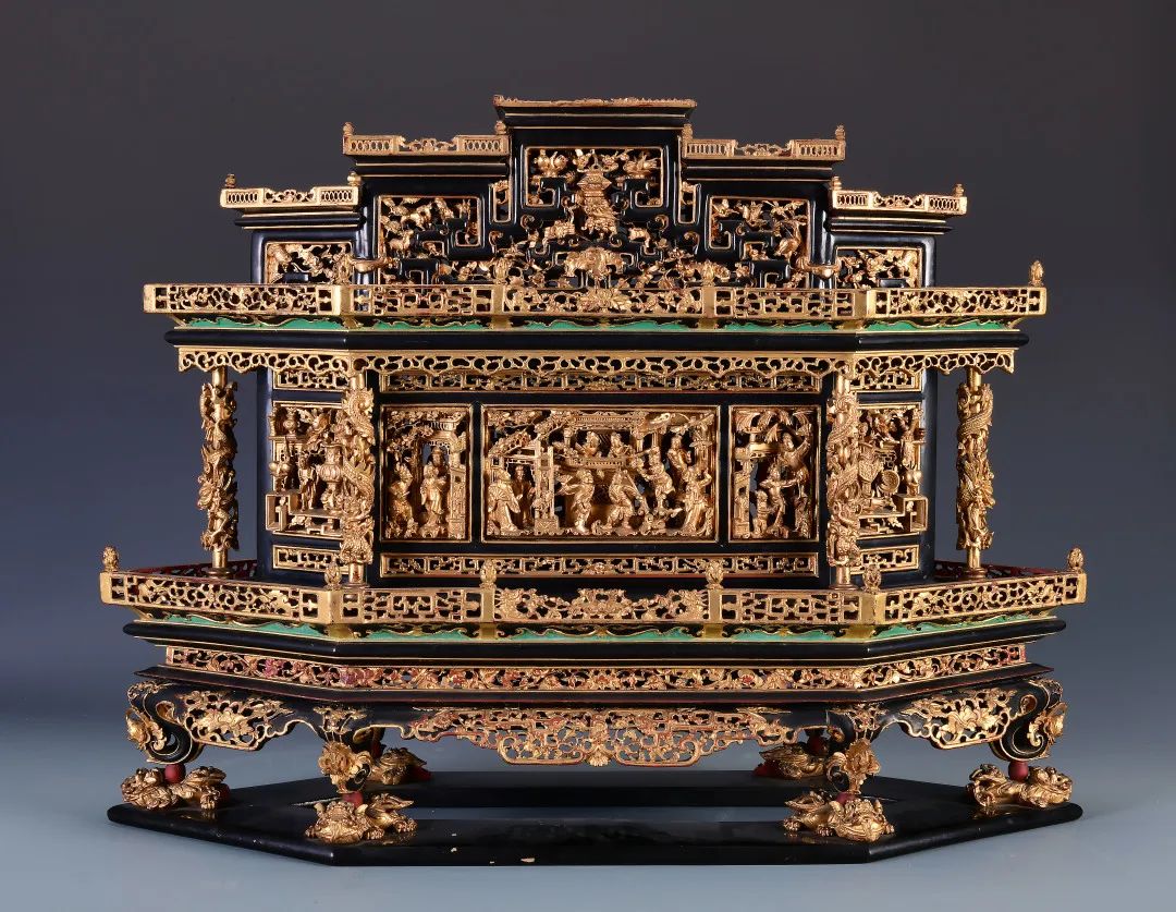 Gold lacquered carved wooden serving box with story patterns, Qing Dynasty (1644-1911) [Photo/Official WeChat account of the Guangdong Folk Craft Museum]
