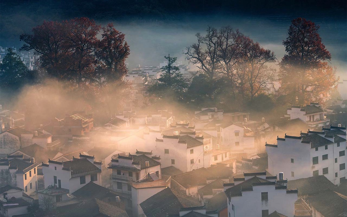 Huangling village in Wuyuan county, Jiangxi province features typical Hui-style buildings with black roof tiles and white walls. When it is shrouded by mist, the village presents a picturesque landscape.
