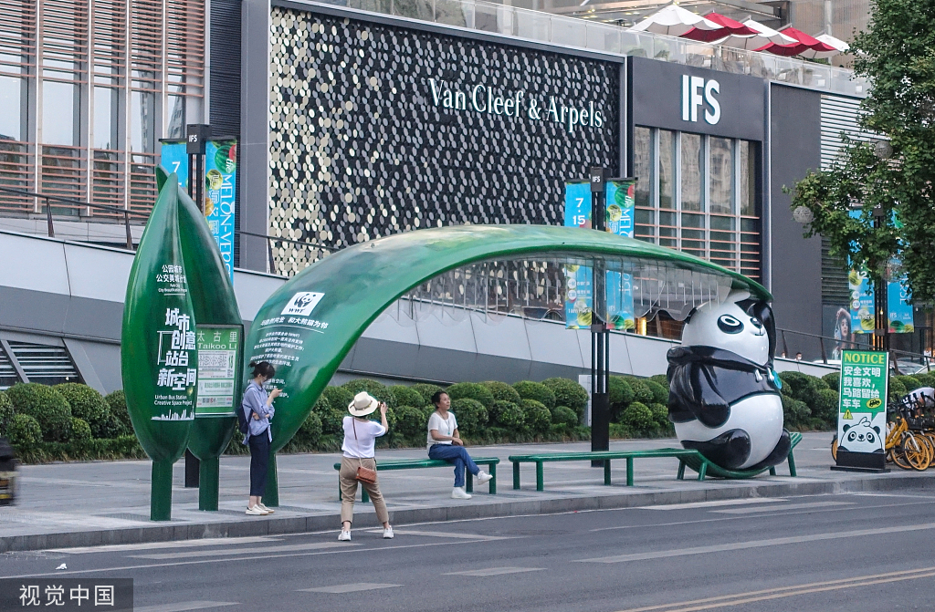 People wait for the bus at a panda-themed bus station in Chengdu, Sichuan province, Aug 22, 2022. [Photo/VCG]