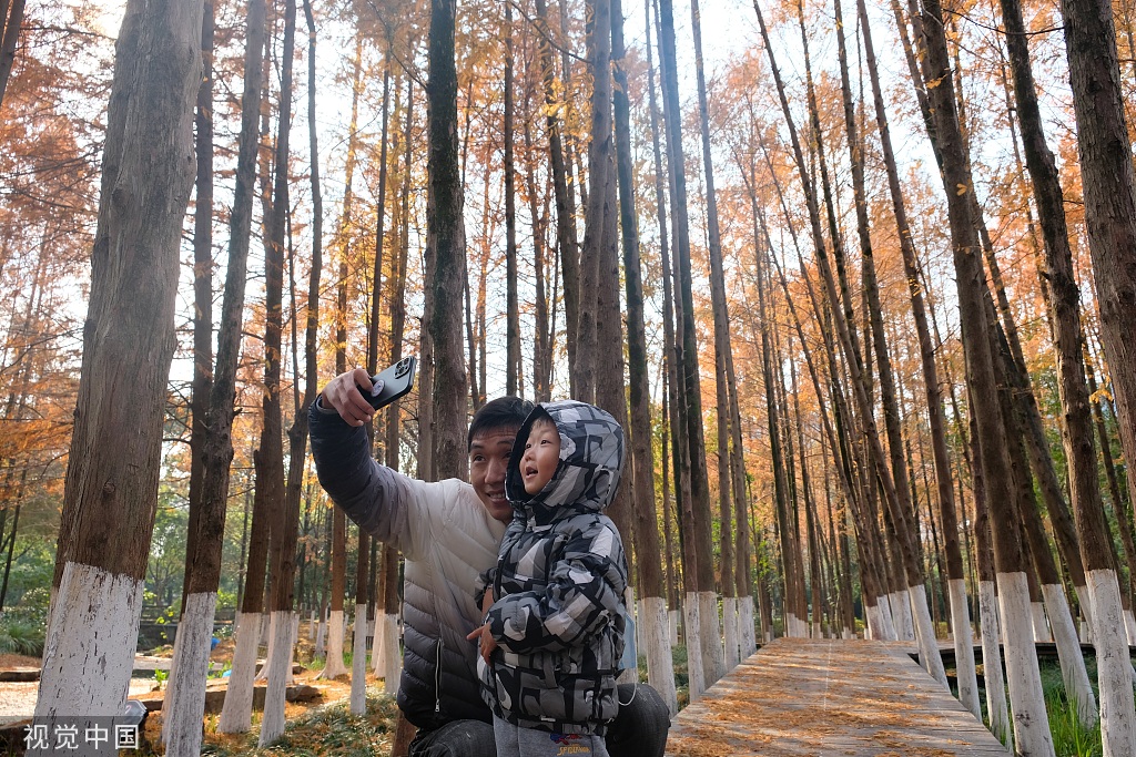 Visitors take selfies at a forest in Ningbo, Zhejiang province, Dec 17, 2022. [Photo/VCG]