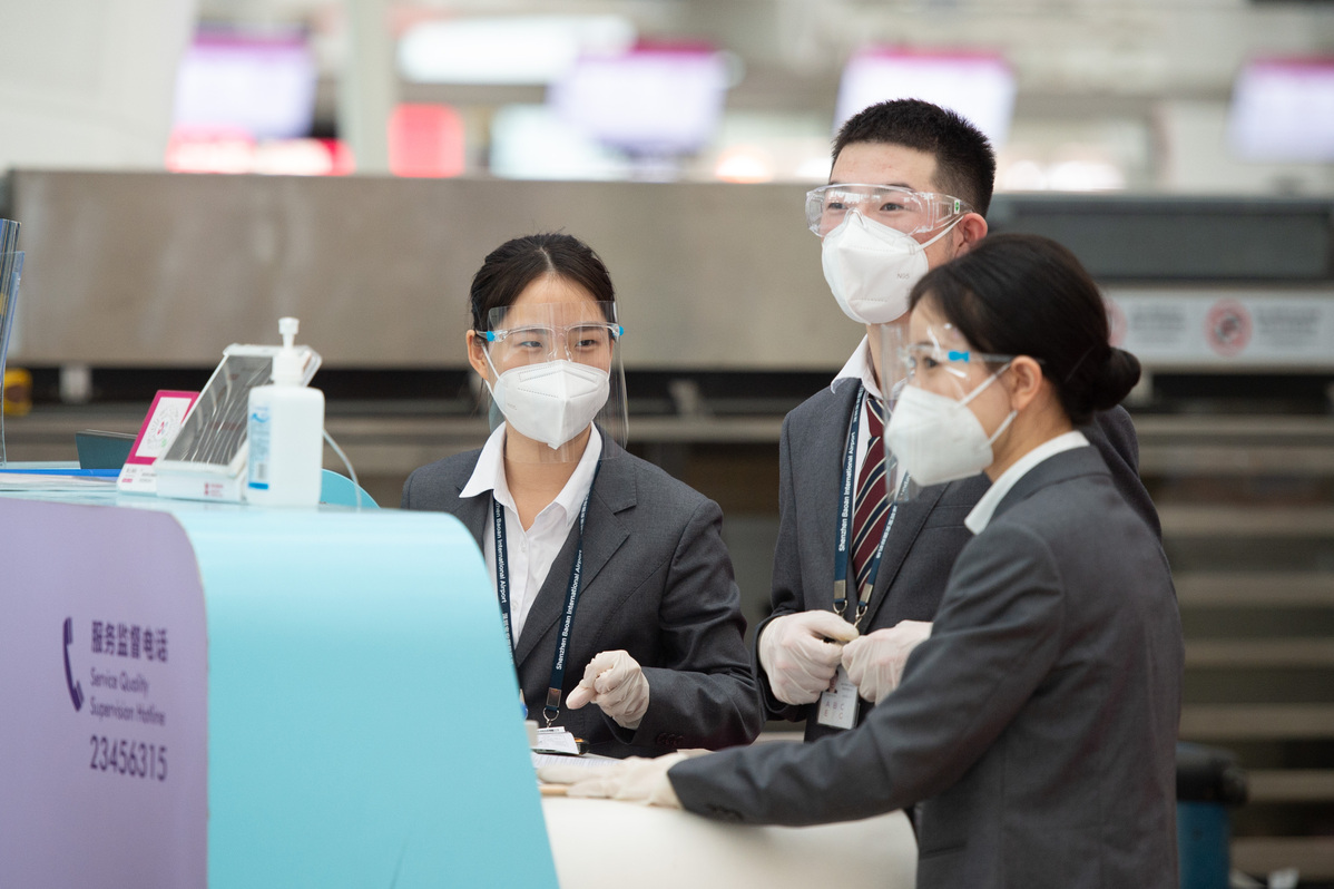 Staff members talk with each other at Shenzhen Baoan International Airport on Jan 12, 2023. [Photo/VCG]