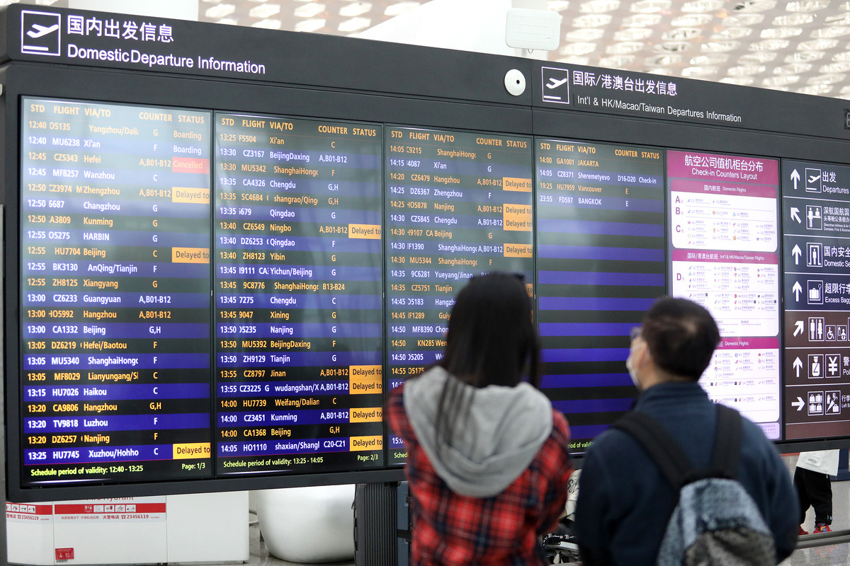 Travelers look at the departure information at Shenzhen Baoan International Airport on Jan 12, 2023. [Photo/VCG]