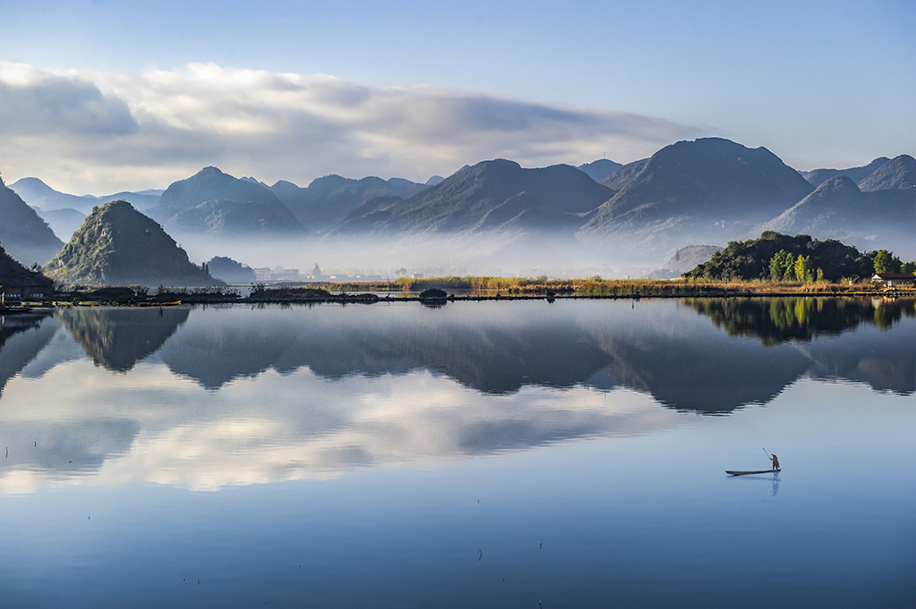 What a lovely landscape at Puzhehei Karst National Wetland Park in Qiubei county, Wenshan Zhuang and Miao autonomous prefecture, Yunnan province! It features beautiful lakes, majestic mountains, and karst caves.