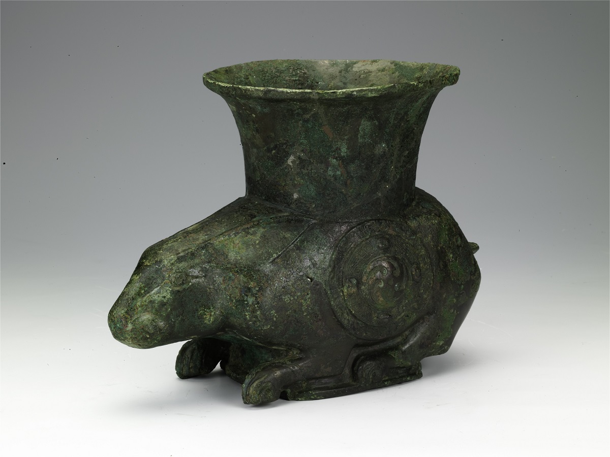Here is a bronze zun vessel in the shape of a resting rabbit, with its two ears flat against its back and four legs curled up. Its hollow body is used to hold wine and its large trumpet-shaped mouth tells its function. Circular lines decorate the two sides of the rabbit’s belly.