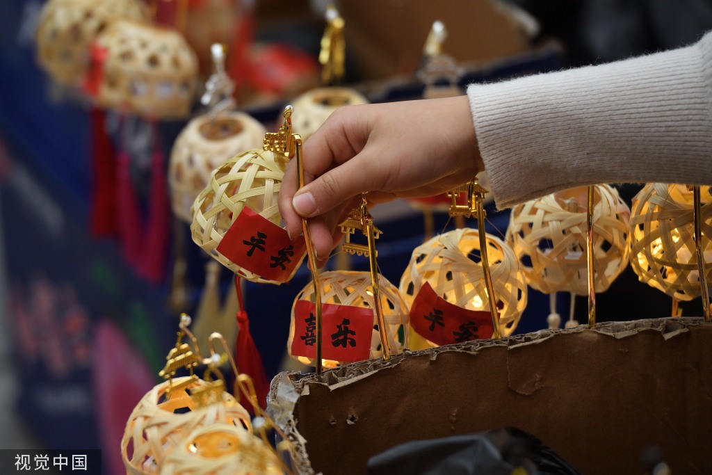 A customer selects mini-lantern made by bamboo for upcoming Spring Festival in Chaozhou, Guangdong province, Jan 15, 2023. As the Year of the Rabbit approaches, more people have started buying food and decorations across China. [Photo/VCG]