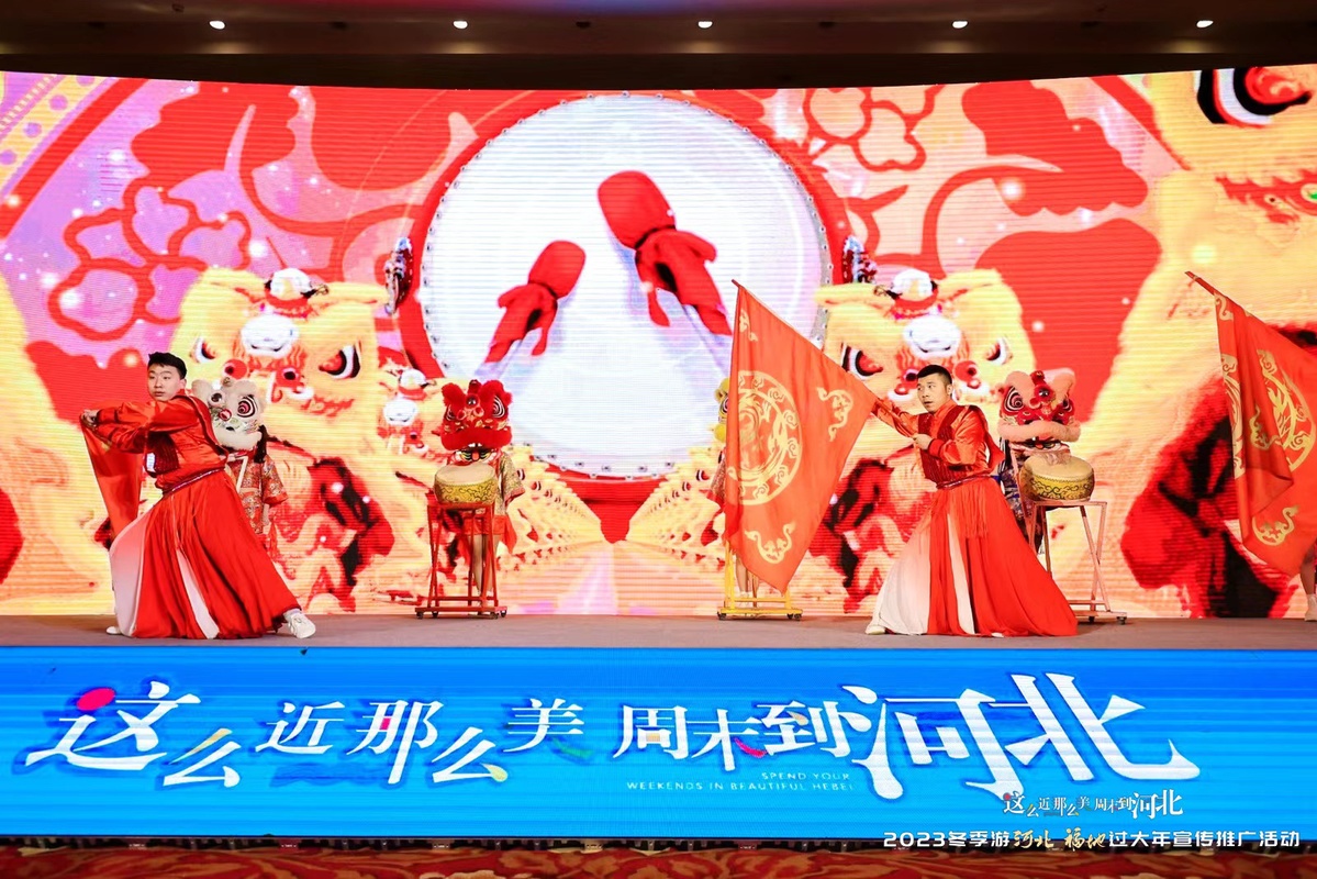 Lion dance performance is staged at the Hebei winter tourism promotion event in Beijing. [Photo provided to China Daily]
