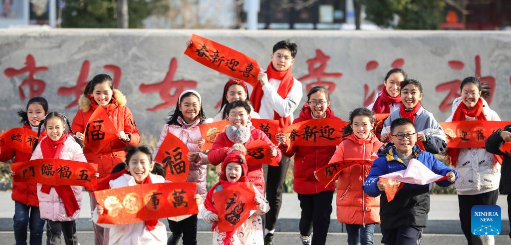 Kids display Chinese character "Fu" meaning fortune and luck in English, and couplets written by themselves during an event held to greet the upcoming Spring Festival in Huai'an city, East China's Jiangsu province, Jan 18, 2023. [Photo/Xinhua]