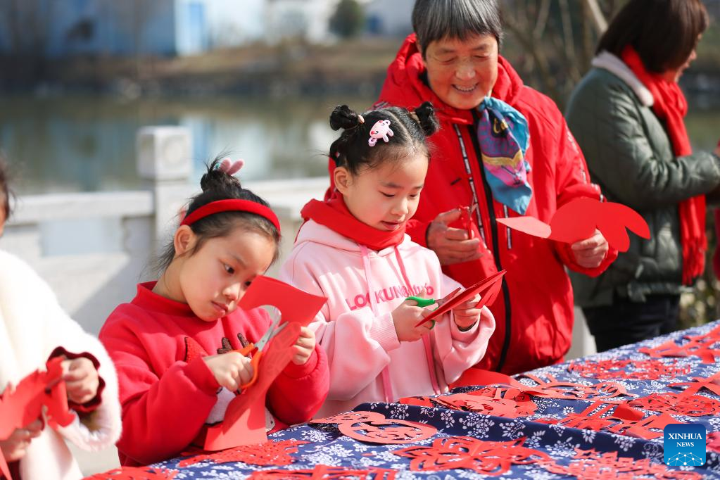Kids make paper-cutting decorations to greet the upcoming Spring Festival in Luoshe town of Deqing county, Huzhou city of East China's Zhejiang province, Jan 19, 2023. [Photo/Xinhua]
